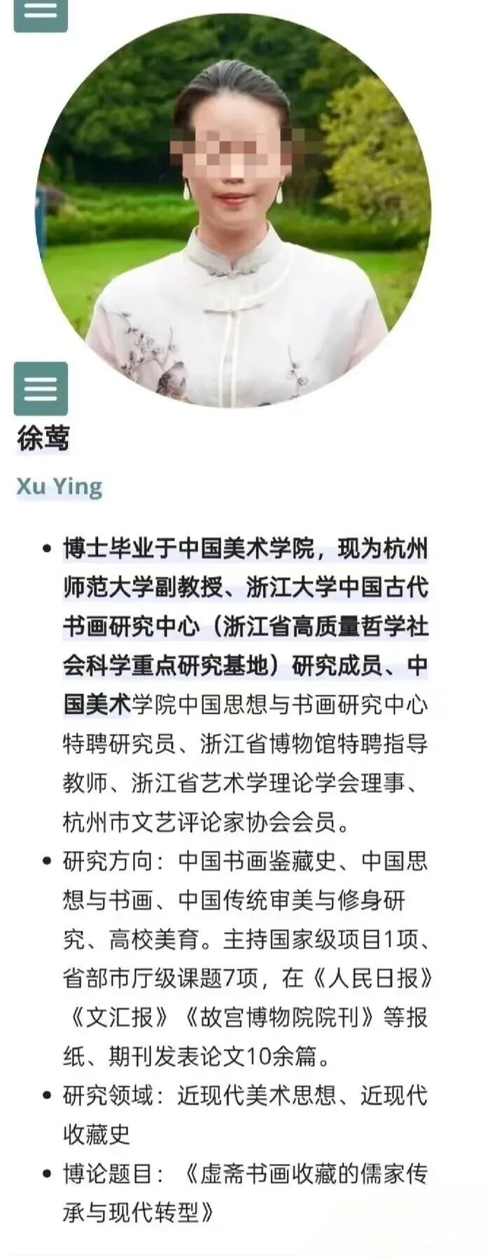 杭州师范大学生物专业毕业,硕士论文研究的是植物病毒。2014年突然变身“庞莱臣曾外孙女”,被南博隆重推出。法院判决她是假的。